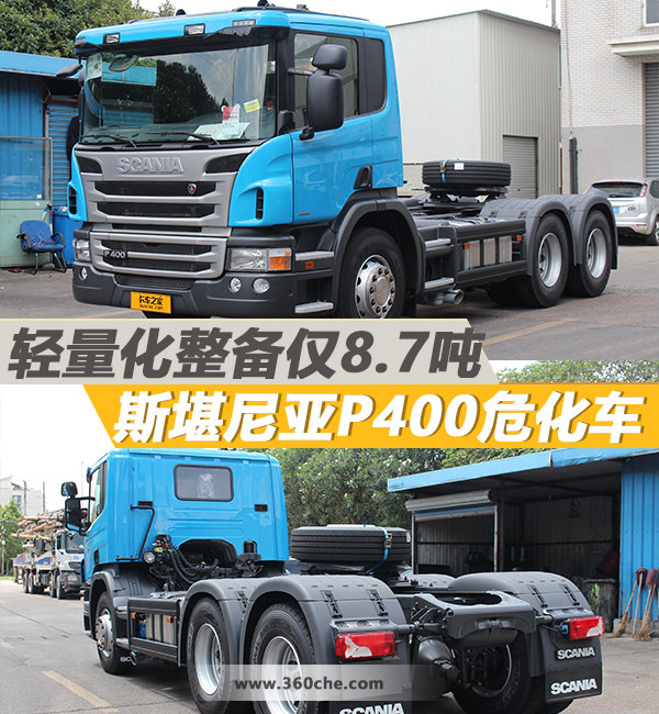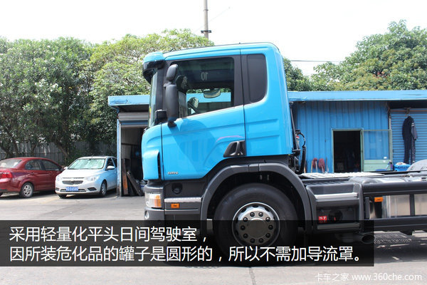 斯堪尼亚P400危险品运输车采用轻量化平头日间驾驶室。这台车定制用于危化液体运输,罐体大多是圆形,且该车限速80km/h,速度不快,所以不需加导流罩。