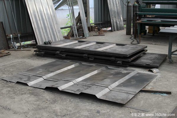 厂房的内部的水泥空地,散落着用于制作集装箱的钢板以及用于铺设集装箱底部的地板。工人师傅们将半成品的光滑钢板根据使用位置的不同,将其冲压成不同的瓦楞形状。使其在不改变集装箱的钢板厚度情况下,达到更高的承载强度。
