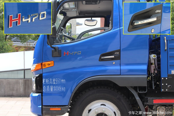 再看侧面,由前照灯和转向灯形成的导风槽延伸至车门腰线,H470表明了该车为4700mm的轴距,另外开门把手也延续了江淮的一贯风格,并带有镀铬装饰和品牌标识。