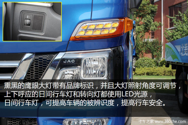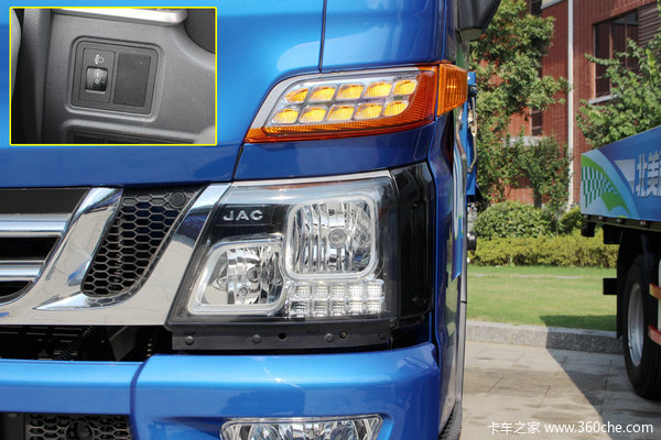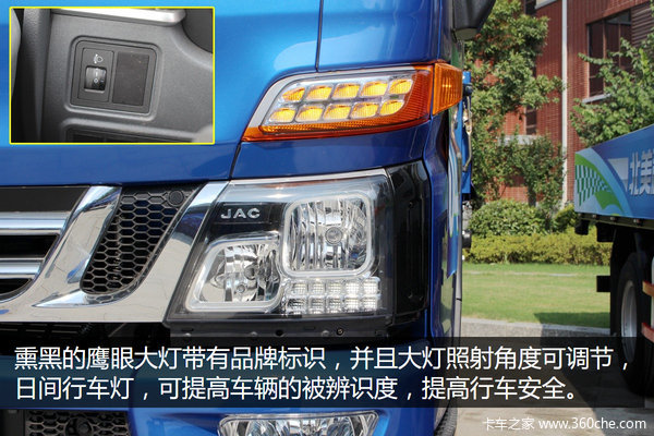 V系驾驶室正面凹凸有致,柔美中又透露着刚劲,吸睛的就是镀铬的V型进气格栅和鹰眼组合的前照灯,熏黑设计很有动感大方,并凸显JAC的品牌标示。大灯还具有照射角度可调节功能,配合整个驾驶室风格,保险杠造型也很刚劲,标配雾灯,并有下防护装置。