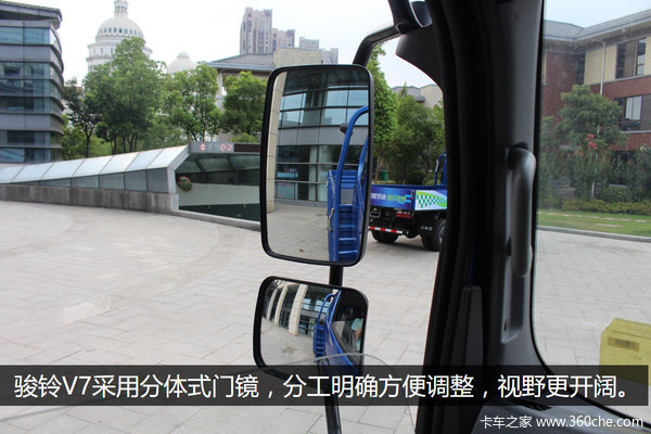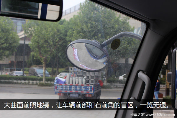 骏铃V7采用分体式门镜,分工明确方便调整,视野更开阔。另外曲面镜的应用也减少了很多驾驶员的视野盲区,大曲面前照地镜,让车辆前部和右前角的盲区,一览无遗。
