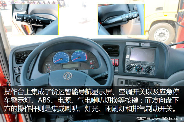 天锦整个的操作台几乎和天龙一样,采用半包围是操作台,比较占用驾驶室空间。操作台上集成了货运智能导航显示屏、空调开关以及应急停车警示灯、ABS、电源、气电喇叭切换等按键;而方向盘下方的操作杆则是集成喇叭、灯光、雨刮器和排气制动开关。