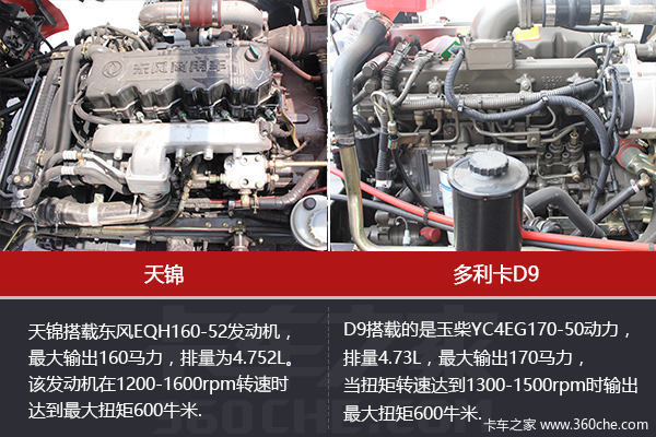 天锦和D9在底盘配置方面有很多相似之处,风神动力和玉柴动力在中卡领域都积攒了不错的口碑,但天锦做为中卡,其稳定性已经在得到市场的认可。多利卡D9是从轻卡升级而来,载重性能还需市场和用户的检验。
