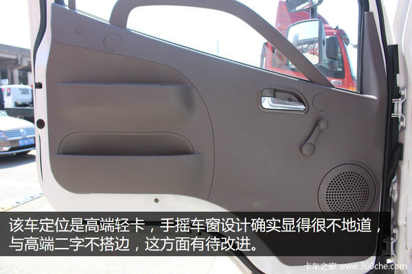 打开车门,镶嵌在灰色车门上的镀铬车门开关格外醒目。但是当看到一个小摇把的时候,心里落差很大。该车定位是高端轻卡,手摇车窗设计确实显得很不地道,与高端二字不太搭边,这方面有待改进。