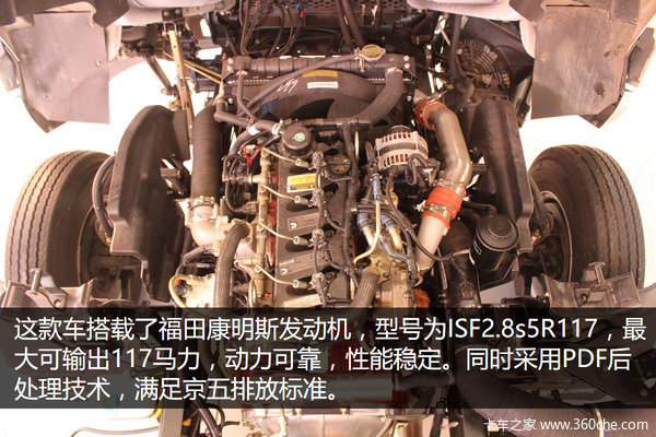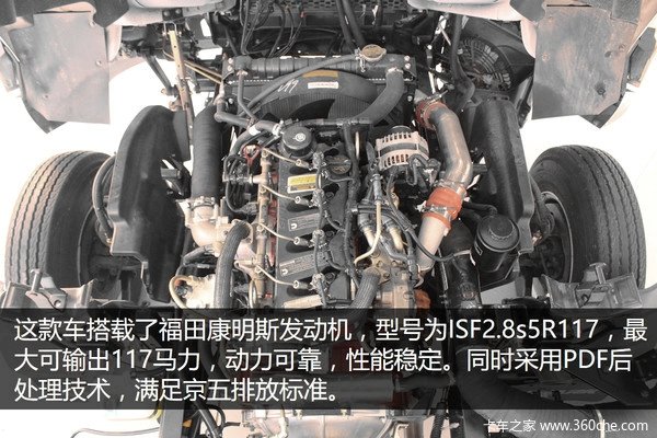 这款车搭载了福田康明斯发动机,型号为ISF2.8s5R117,最大可输出117马力,这样的动力足以胜任城镇运输的各种工况需求。另外,福康发动机有个优势,其模块化设计使发动机动力可靠,性能稳定。不过这种模块化设计也存在缺点,就是在以后维修的时候费用较高。