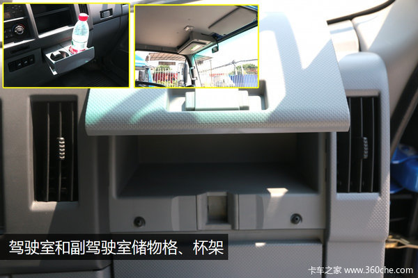 储物空间是这款车亮点之一,上述车门可以放两大瓶水以外,中控台还可以放多两瓶450ml水。驾驶室天花板有一个带纱网口的储物层,放一些施工文件之类的文件非常合适。缺点则是副驾驶储物箱虽然容积可观,但是开口影响了存取便利性和视野。