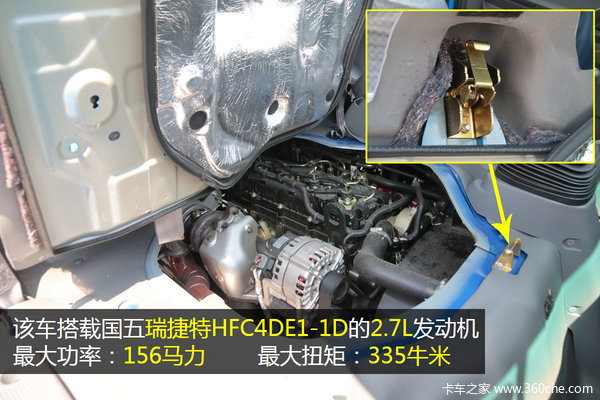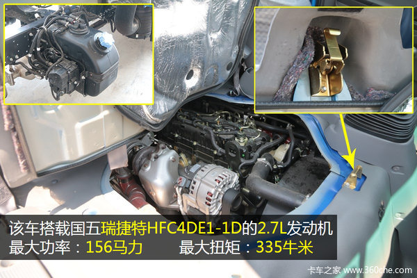 该车搭载江淮锐捷特国五HFC4DE1-1D的2.7L发动机,最大功率156马力,最大扭矩335牛米。锐捷特2.7L作为江淮自主研发的国五柴油发动机,集成了1800bar高压共轨、增压中冷、DOC+SCR等一系技术于一身,具有高性能、低排放的特点。