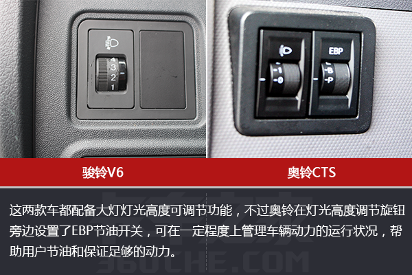 这两款车都配备大灯灯光高度可调节功能,驾驶员可以在不同的行驶工况调节最合适的灯光高度,行车更加安全。不过奥铃在灯光高度调节旋钮旁边设置了EBP节油开关,可在一定程度上管理车辆动力的运行状况,帮助用户节油和保证足够的动力。