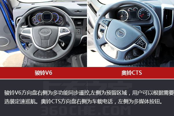 骏铃V6和奥铃CTS方向盘都采用四幅式设计,颜色搭配也很相近,但细微之处也有差别。骏铃V6方向盘右侧为多功能同步遥控,左侧为功能预留区,用户可以根据需要选装定速巡航。奥铃CTS方向盘右侧为车载电话,左侧为多媒体按钮。