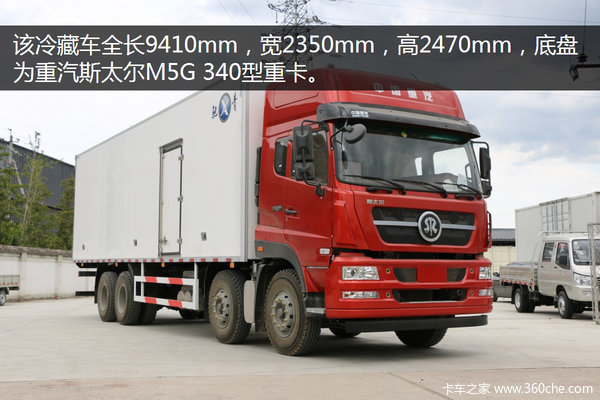 来卡车之家App【卡车之家 原创】日前,卡车之家评测团队来到了北京天成华瑞汽车销售有限公司,在这里我们见到了一辆重汽斯太尔8×4冷链运输车,该车采用了斯太尔M5G 340底盘。这辆车不仅选装多项配置,最特别之处在于它还是北京首辆斯太尔M5G冷链运输车。