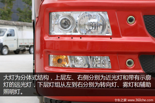 大灯采用分体式设计,上层左侧和右侧分别为带透镜的近光灯和带有式廓灯的远光灯,下层灯组从左到右分别为转向灯、雾灯和辅助照明灯。整体来说,该大灯的设计还是拘泥于传统,缺乏创新元素。