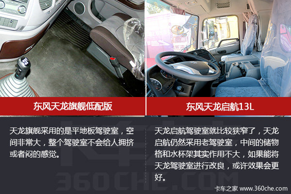 驾驶室方面,天龙旗舰采用的是欧式风格平地板驾驶室,空间非常大,整个驾驶室不会给人拥挤或者闷的感觉;不过天龙启航驾驶室就比较狭窄了,天龙启航仍然采用日系驾驶室,但是空间利用率更大,如果能将天龙启航驾驶室适当的改良和扩大,或许效果会更好。