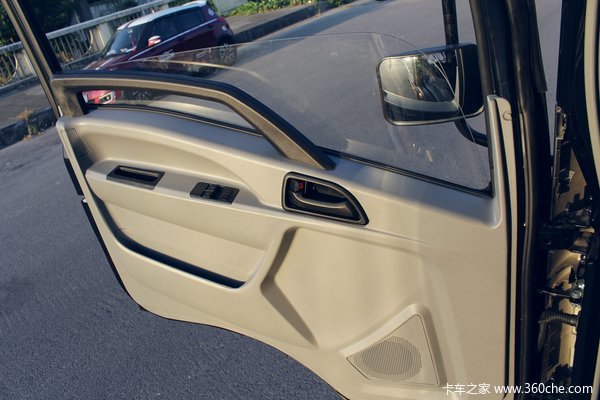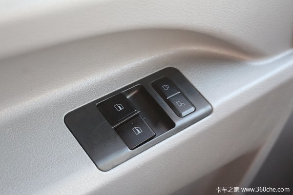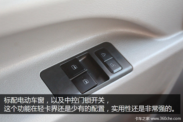 该车标配电动车窗,尽管没有一键升降功能,也没有开关控制副驾驶操作按钮,但是对于宽体驾驶室来说,电动车窗的应用,还是很有价值的。另外在电动开关前方还布置有中控门锁开关,这个功能在轻卡界还是不常见的配置,实用性也是非常强的。