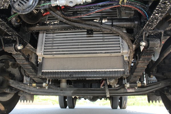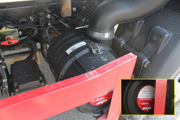 空气滤清总成采用常见的横置式,这对于虽然该车上装为经销商定制,主要用于展示,但在一些细节方面还显得不很合理,侧防护和空滤的拆装会产生干涉,和上面尿素罐一样,很不方便。
