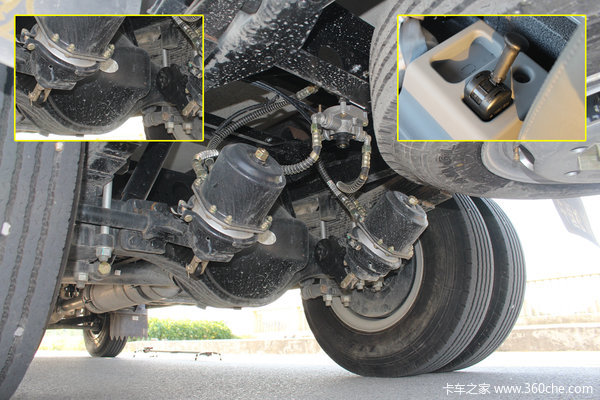 后桥一样是采用曼技术,型号为HGC055QJ,采用加强型5.5吨级鼓式制动,并带有断气刹,速比为4.11,后桥板簧为9+7片。