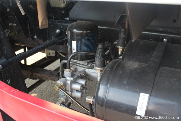 大梁左侧布置空气处理单元,四回路保护阀以及干燥罐,采用瑞立品牌。储气筒容积略小,常态下6.5个大气压力,在停车状态深踩几脚刹车,便可在仪表盘上明显看到气压值降低。在低于5.5个大气压力时,仪表上会亮起气压警报灯,并有蜂鸣声。