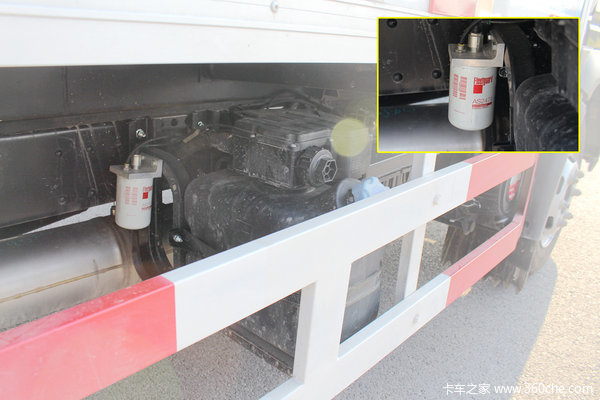整车通过SCR技术满足国五排放,在大梁右侧装有康明斯配套的尿素罐以及尿素供给和控制单元,尿素罐后方有油水分离器,建议每20000公里更换一次,也就是和发动机保养同步进行。