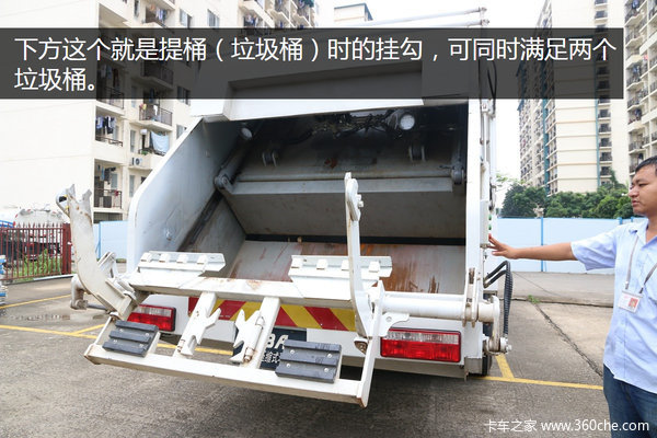 下方这个就是提桶(垃圾桶)时的挂勾,可同时满足两个垃圾桶,然后向后空翻就能将垃圾倒进货厢,接着再进行压缩把垃圾推出内部就可以了。其中上装右边控制开关则可进行装/卸垃圾作用。具体操作步骤为:1、后门开启 2、提桶 3、一次循环 4、卸桶 5、后门关闭再停止,这样即可完成一次装卸垃圾。