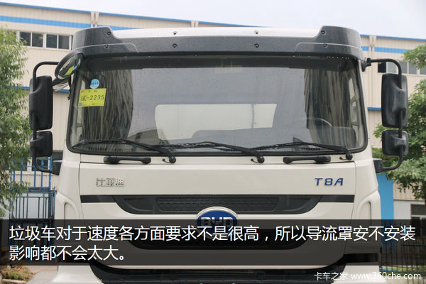压缩式垃圾运输车对于速度各方面要求不是很高,所以基本都不会安装导流罩。上方带有遮阳罩,另外该车后视镜采用多片组合设计,算上主副驾驶室、前照地镜共有六块镜片组合,减少行车盲区,提高安全性。除此之外,该车采用一体式大灯设计,内部集成远、近光灯、雾灯以及转向灯,其中近光灯带有透镜设计。此外牌照下方设有一级踏板,保险杠下方则设有防钻入大梁。