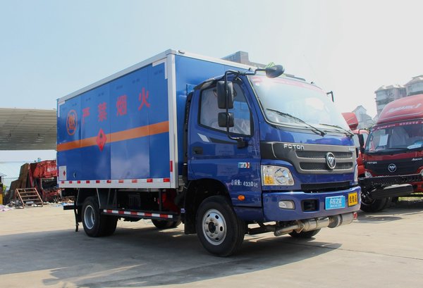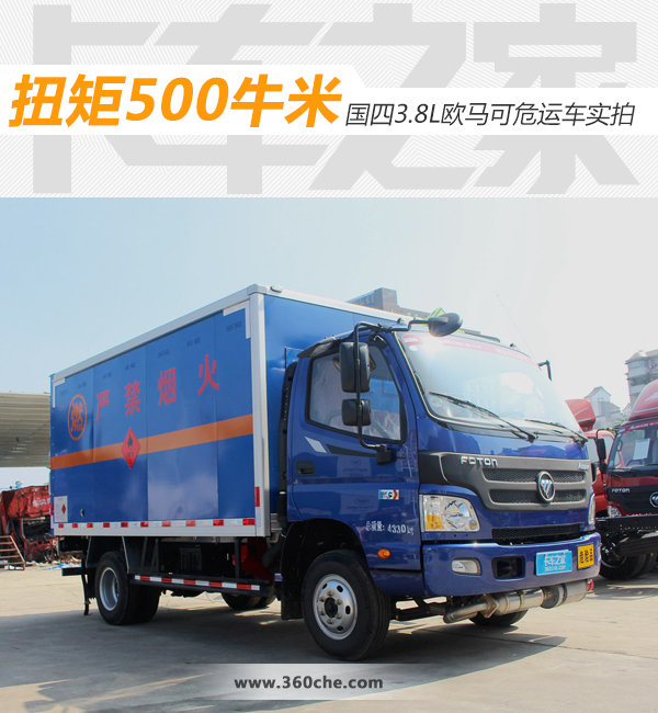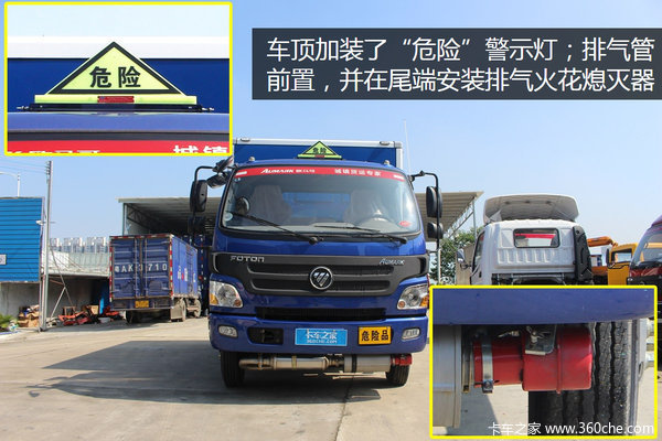 这款车采用的是欧马可危运车专用底盘,与普通版本不同的是,危运版车顶加装了“危险”警示灯、排气管前置,尾端安装火花熄灭器,对废气进行冷却,避免废气夹带火花,满足危运车安全运输需要。