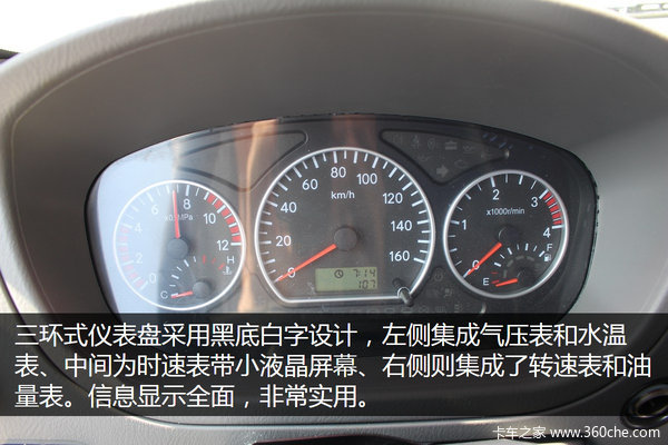 三环式仪表盘采用黑底白字设计,左侧集成气压表和水温表、中间为时速表带小液晶屏幕、右侧则集成了转速表和油量表,信息显示全面,比较实用。