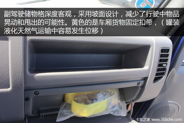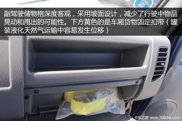 副驾驶储物格容积可观,采用坡面设计,减少了行驶中物品晃动和甩出的可能性。由于罐装液化天然气运输中容易发生位移,下方储物格则配置了是车厢货物固定扣带。