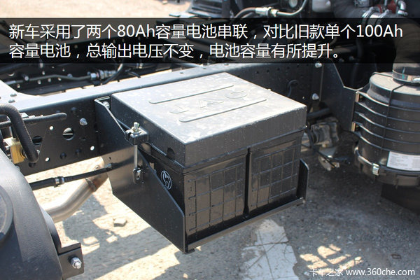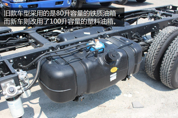骏铃采用了双级柴油滤、离合助力、气刹,同时按照政策规定,新批出厂车型均标配ABS防抱死制动系统。新车部件改动方面,一是原80升铁油箱,改用为100升工程塑料油箱,二是电池串联容量升级为160Ah。