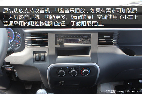 去年底发布的新款骏铃对比老款在内饰上也有较大的变化,整体风格趋向于乘用车的设计,质感提升,用户好评度更高,并且可后期加装支持方向盘多功能按键操作的原厂大屏影音导航系统。另外可以看到,该国五新车增配了定速巡航功能,按键设置在方向盘左侧,操作简便。