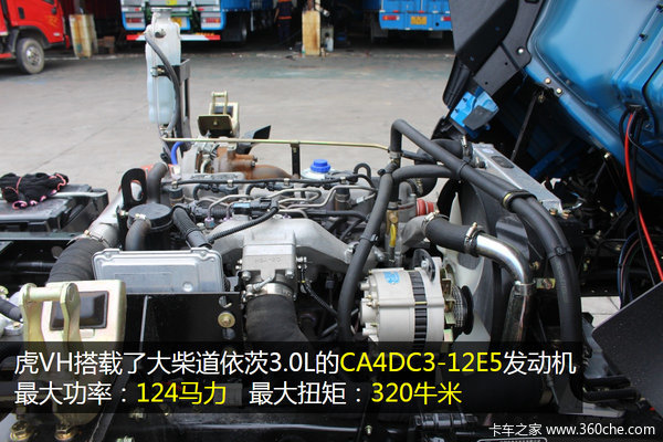 虎VH搭载了大柴道依茨3.0L的CA4DC3-12E5发动机,最大功率:124马力,最大扭矩:350牛米。充足的动力也为优质的产品运输服务提供了可能。