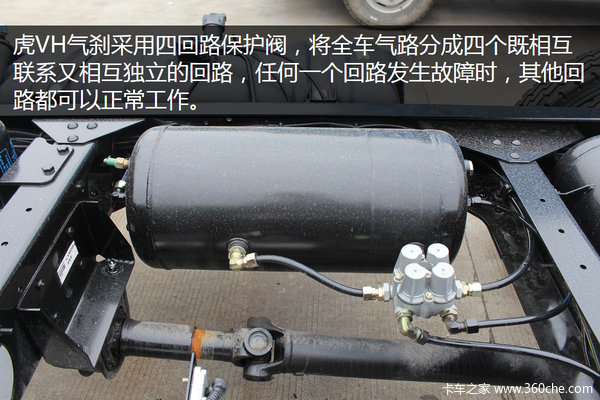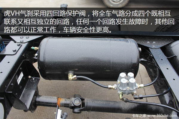 虎VH气刹采用四回路保护阀,将全车气路分成四个既相互联系又相互独立的回路,任何一个回路发生故障时,其他回路都可以正常工作,车辆安全性更高。这也是国五版本的标志之一。