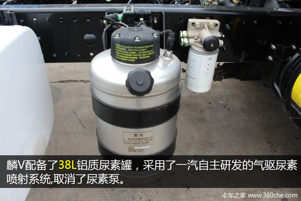 麟V配备了38L铝质尿素罐,采用了一汽自主研发的气驱尿素喷射系统,取消了尿素泵。