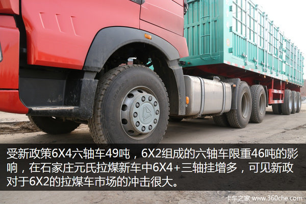受新政策6X4六轴车49吨,6X2组成的六轴车限重46吨的影响,在石家庄元氏拉煤新车中6X4+三轴挂增多,可见新政对于6X2的拉煤车市场的冲击。此外7.6吨的重汽豪瀚拉煤版也即将在石家庄开卖,石家庄的运煤企业也比较期待这款车。