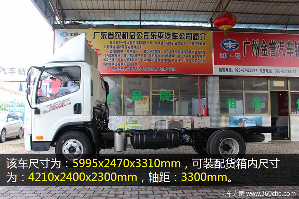 该车可装配货箱内尺寸为:4210x2300x2300mm,轴距为3300mm。