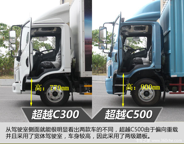超越C300主打标准、快速和高效的城市内物流运输,超越C500是在超越C300的技术平台上,针对城际运输需求推出的,延续了C300轻卡系列高速高效、操纵便捷、安全舒适和清洁环保等优势,同时也结合了国内城际中长途运输的需求。