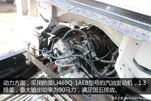 动力方面,该车采用的是LJ469Q-1AEB型号的汽车发动机,1.3排量,最大输出功率为90马力,满足国五排放标准。