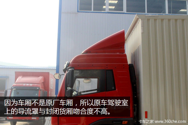 因为车厢不是原厂车厢,所以原车驾驶室上的导流罩与封闭货厢吻合度不高,如果导流罩能够和车厢完全吻合,则更加有利于减小风阻,提高燃油效率。
