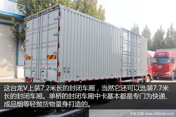 这台龙V上装7.7米长的封闭车厢,当然它还可以选装7.2米长的封闭车厢。单桥的封闭车厢中卡基本都是专门为快递、成品烟等轻抛货物量身打造的。在GB1589对于车辆制造的尺寸限制中,单桥封闭厢车的整车尺寸放宽到12米,所以意味着未来还会有更长的封闭车厢出现。