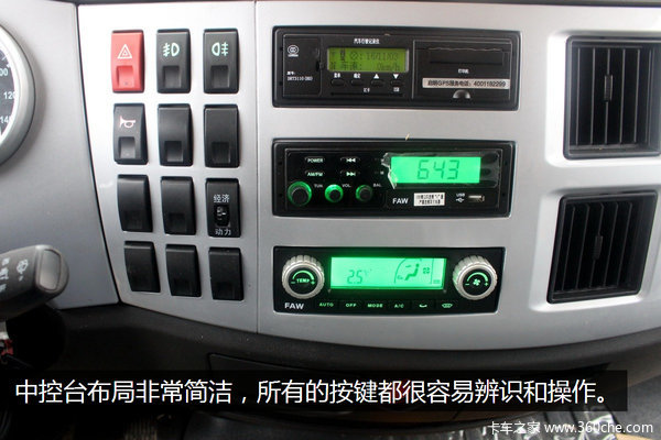 中控台也是非常简单,集成了应急指示灯、雾灯、电气喇叭转换开关、节油开关、行车记录仪、收音机和空调开关以及出风口,简单操作,驾驶员伸手就能操作。