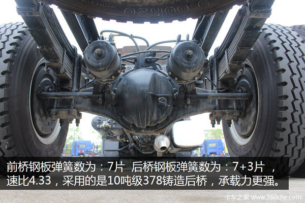该车前桥钢板弹簧数为:7片,后桥钢板弹簧数为:7+3片。采用的是10吨级378铸造后桥,速比4.33承载力更强,同时标配国产ABS。