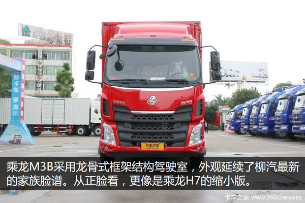 这款乘龙M3B整体采用红色涂装,相比于之前的M3车型,外观方面基本上可以算是改头换脸,设计风格向乘龙H7靠拢,但看起来比H7更精炼。前两同样采用黑色的大嘴,中间部分用镀铬装饰条点缀,突出柳汽徽标。