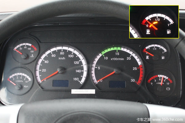 而仪表盘的设计则是对称式,并且融合多种颜色在其中。各种功能指示灯也都集中布置在上层,更便于信息的读取。在布局方面,尿素溶液和燃油指示被集合在了一起,燃油用指针指示,尿素溶液则用灯光表示。