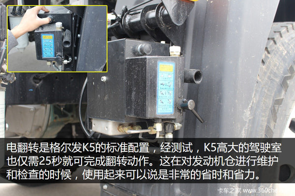 并且驾驶室采用了电翻转,电翻转也是格尔发K5w的标准配置。经过测试,K5w高大的驾驶室也仅需25秒,就可完成翻转动作。这在对发动机仓进行维护和检查的时候,使用起来可以说是非常的省时和省力。
