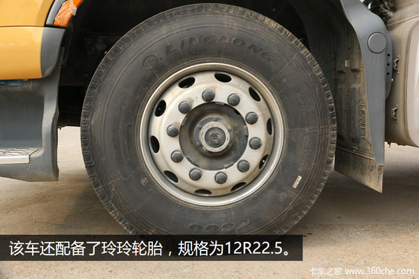 实拍的这台H7采用了金黄色涂装,两侧的后视镜为一体式设计,黑色的镜壳上配有镀铬装饰,看起来很漂亮。该车在选装了铝合金轮毂,气囊悬架之后,车身自重可以降低到7.9吨。按照目前6x4车型准许最大总重49吨的规定,它还可以拖挂40吨。
