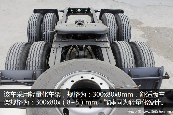 底盘是质惠版与普通版区别最明显的地方,该车标配半铝壳变速箱、11mm高强度钢轮毂、轻量化车架、鞍座设计,目前整车自重为8.6吨。除此之外,用户还可根据自身需求选装铝合金轮毂,整车降重220kg。
