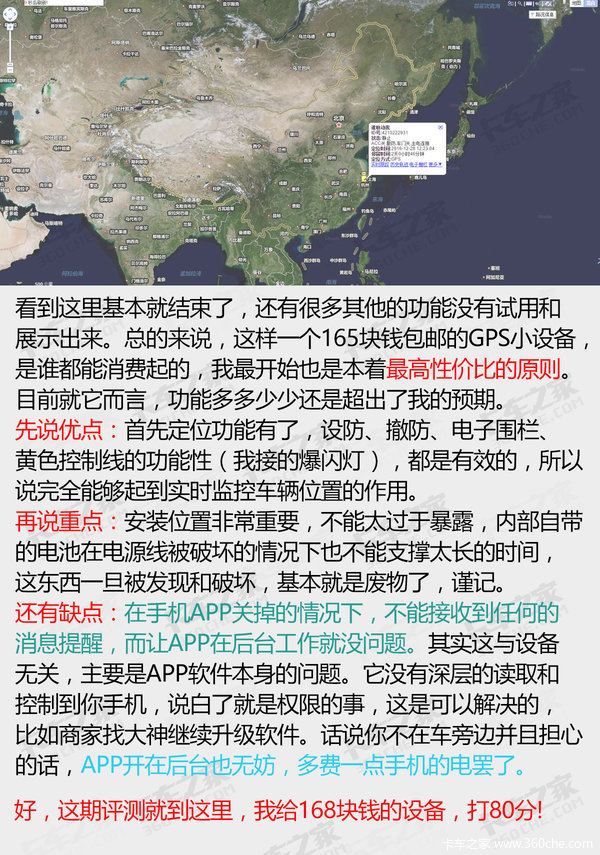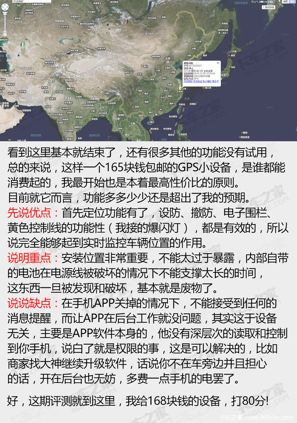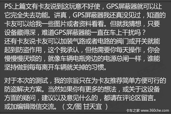 这样一个设备,可以说安装后基本就一劳永逸的了,当然你也可以说这只是一个自我慰藉而已。换个角度想想它,简单、有效、直接,就算是图个心里安慰,那也比寒夜里起身出门看车强吧。松江卡友王一鹏丢车后,他的很多朋友夜里都是睡在车上的,我也只想能找个这样的小东西来解决卡车司机的一点烦恼,装好了回家踏实休息,不放心,手机打开看看,如此简单。(文/图 甘天宜)