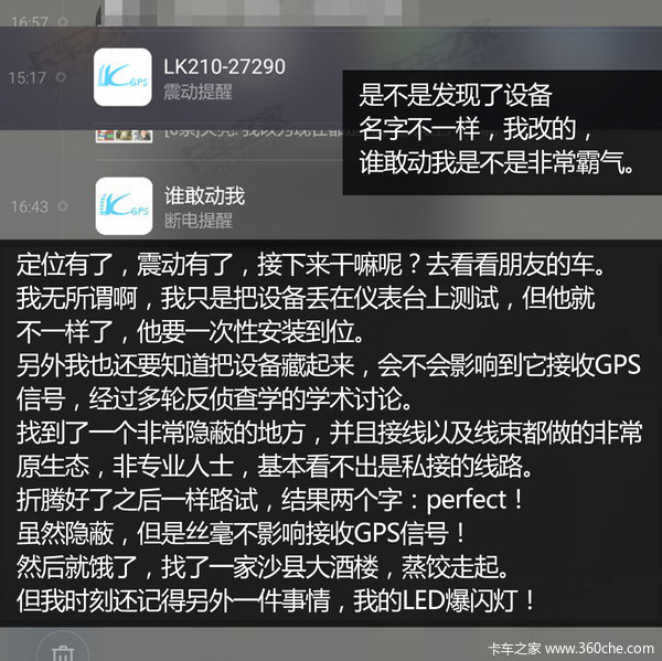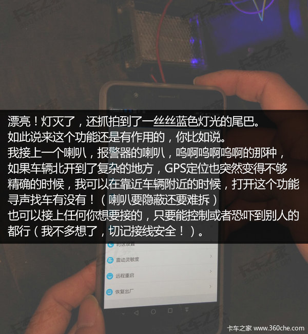 这样一个设备,可以说安装后基本就一劳永逸的了,当然你也可以说这只是一个自我慰藉而已。换个角度想想它,简单、有效、直接,就算是图个心里安慰,那也比寒夜里起身出门看车强吧。松江卡友王一鹏丢车后,他的很多朋友夜里都是睡在车上的,我也只想能找个这样的小东西来解决卡车司机的一点烦恼,装好了回家踏实休息,不放心,手机打开看看,如此简单。(文/图 甘天宜)