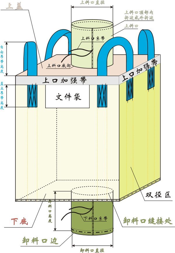 集装袋多为长方体结构,上下带有上料口和下料口,四周的吊带可供吊装之用。