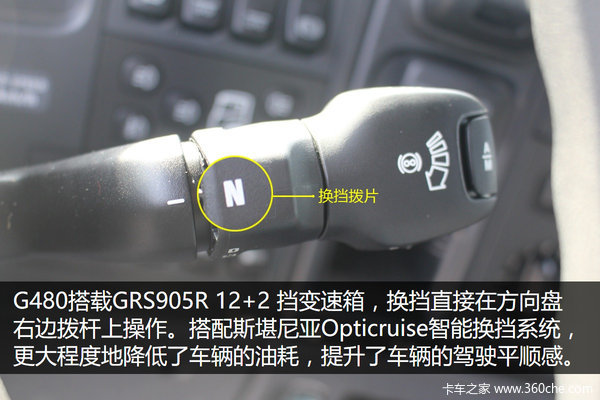 传动方面,G480搭载GRS905R 12+2 挡变速箱,具有出色燃油经济性的发动机搭配斯堪尼亚Opticruise智能换挡系统,后桥速比2.71。更大程度地降低了车辆的油耗,提升了车辆的换挡操纵感。