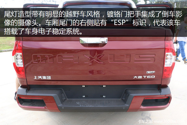 尾部的造型同样采用了大量粗犷的线条来勾勒,尾灯造型带有明显的越野车风格,镀铬门把手集成了倒车影像的摄像头,摄像头带有声音采集。车厢尾门的右侧贴有“ESP”标识,代表该车搭载了车身电子稳定系统。后保险杠上有多处可供用户蹬踏的位置,提升上车便利性。
