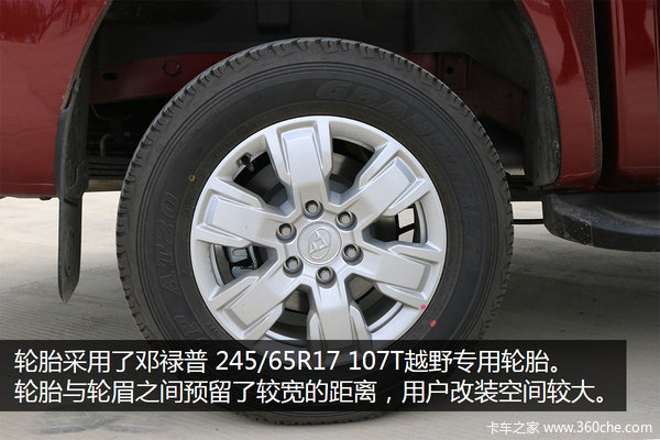 轮胎采用了邓禄普 245/65R17 107T全地形轮胎,单个轮胎最大载重可达到975公斤,轮胎上大量的横向纹理可大幅增加恶劣路况下的抓地力。从图中我们可以看到轮胎与轮眉之间预留了较大的距离,意味着用户拥有丰富的改装空间。
